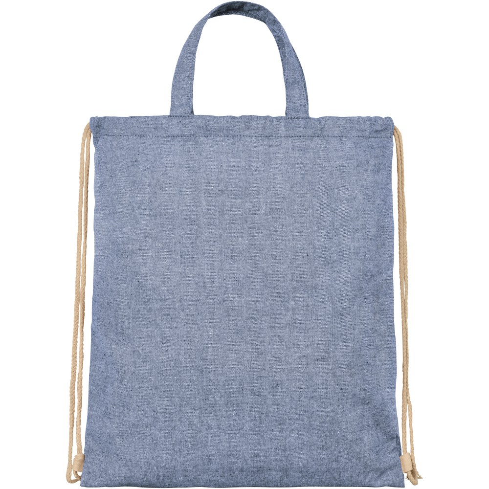 Trekkoordrugzak van 210 g/m² gerecycled katoen-polyester mix. Gerecycled katoen wordt vervaardigd uit voor consumenten bestemd afval dat in textielfabrieken tijdens het snijproces wordt geproduceerd. Groot hoofdvak met katoenen trekkoordsluiting. Voorzien van twee handgrepen met een valhoogte van 14 cm. Door de aard van het productieproces kunnen er kleine variaties zijn in de kleur van het daadwerkelijke product. Geschikt voor een gewicht tot 5 kg.